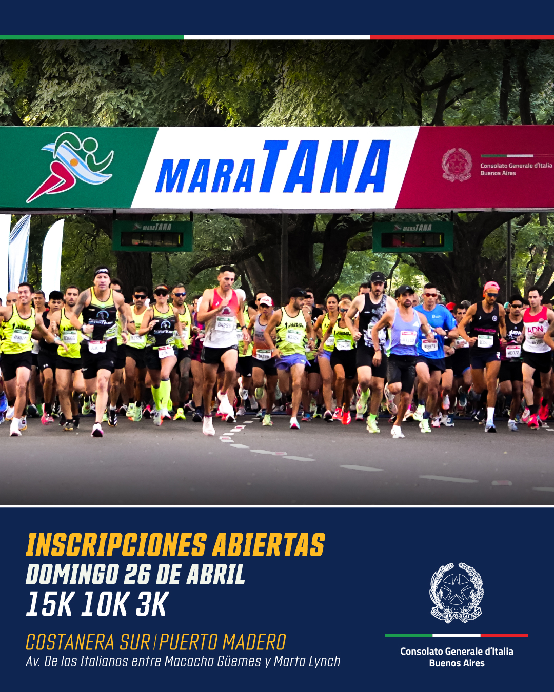 Il Consolato Generale d’Italia a Buenos Aires presenta la IV edizione della “MaraTANA, la corsa italiana”, dedicata alla più grande Comunità italiana al mondo e ormai divenuta una tradizione di incontro, celebrazione delle radici e dei legami unici tra due Paesi amici.