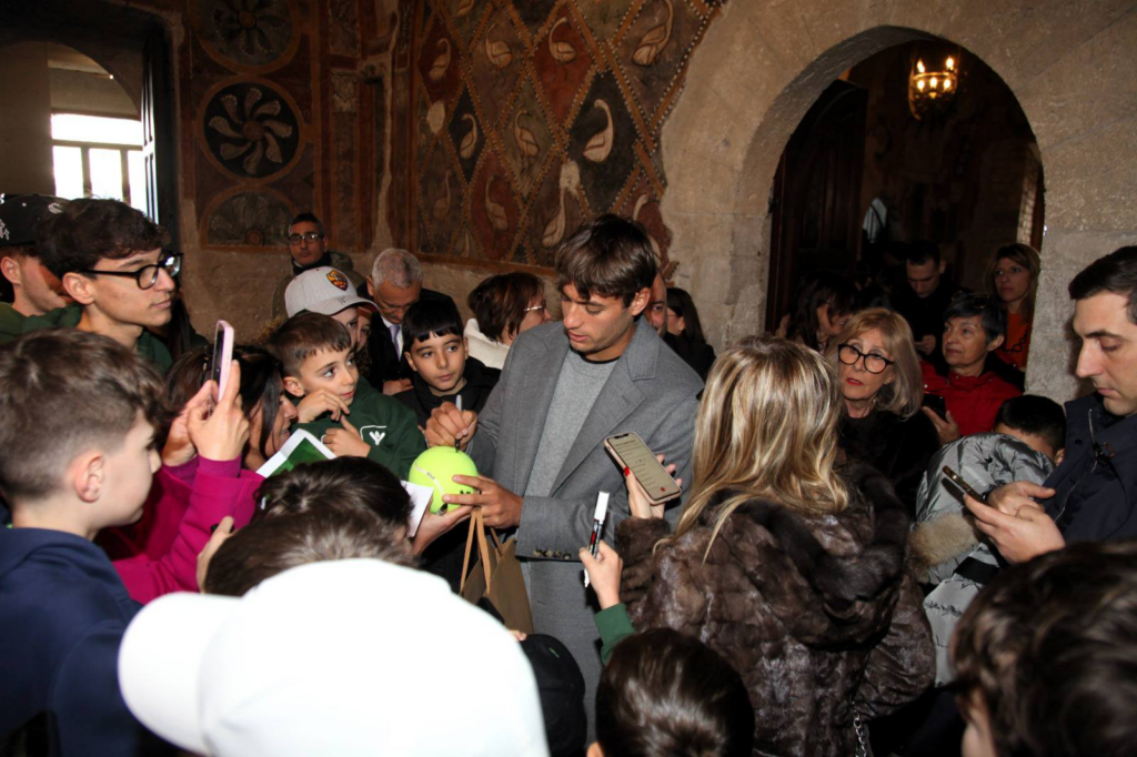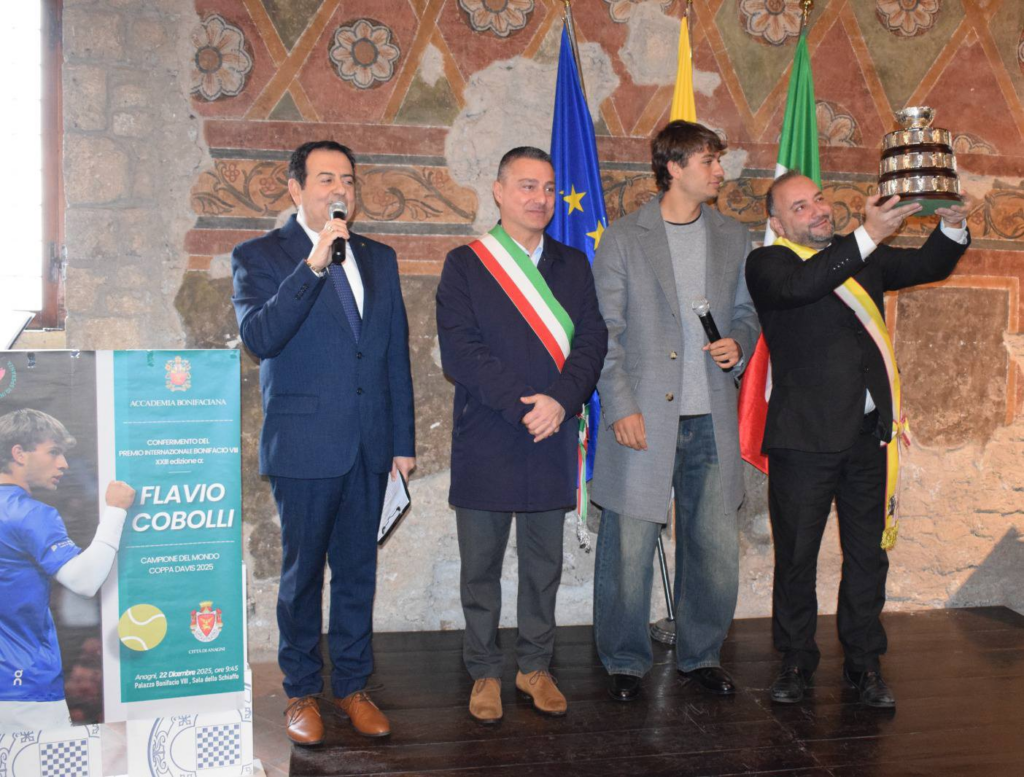 La XXIII Edizione del Premio Bonifacio VIII si è conclusa in bellezza con l’omaggio al campione mondiale di Coppa Davis 2025, Flavio Cobolli, e a suo padre e allenatore Stefano Cobolli. L’Accademia Bonifaciana, guidata dal rettore presidente Sante De Angelis, ha accolto con entusiasmo il giovane tennista, che ha fatto la sua prima tappa ufficiale da campione del mondo proprio ad Anagni, prima di recarsi dal Presidente della Repubblica e dal Presidente del Consiglio. La Sala dello Schiaffo del Palazzo Papale, per l’occasione, era gremita di autorità, giovani tennisti e sportivi, tutti accorsi per omaggiare il campione del tennis e la sua impresa sportiva. L’atleta ha portato con sé la Coppa Davis, che ha mostrato con orgoglio al pubblico presente, creando un’atmosfera di grande gioia e celebrazione.