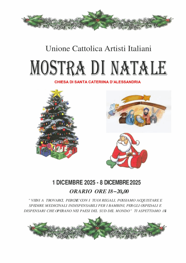 La sezione di Ortona dell’Unione Cattolica Artisti Italiani (Ucai) con il patrocinio del Comune di Ortona, domenica 30 novembre, alle ore 17, inaugurerà la mostra artistica dedicata al Santo Natale nella chiesa di S. Caterina d’Alessandria (corso Garibaldi 19). L’evento, gratuito e aperto al pubblico, vedrà la partecipazione del Presidente Novelia Marinozzi, con il consulente ecclesiastico Don Pino Grasso e il parroco Don Roberto Giroldi e del Sindaco, Angelo Di Nardo, accompagnato dagli assessori Antonio Sorgetti e Italia Cocco.