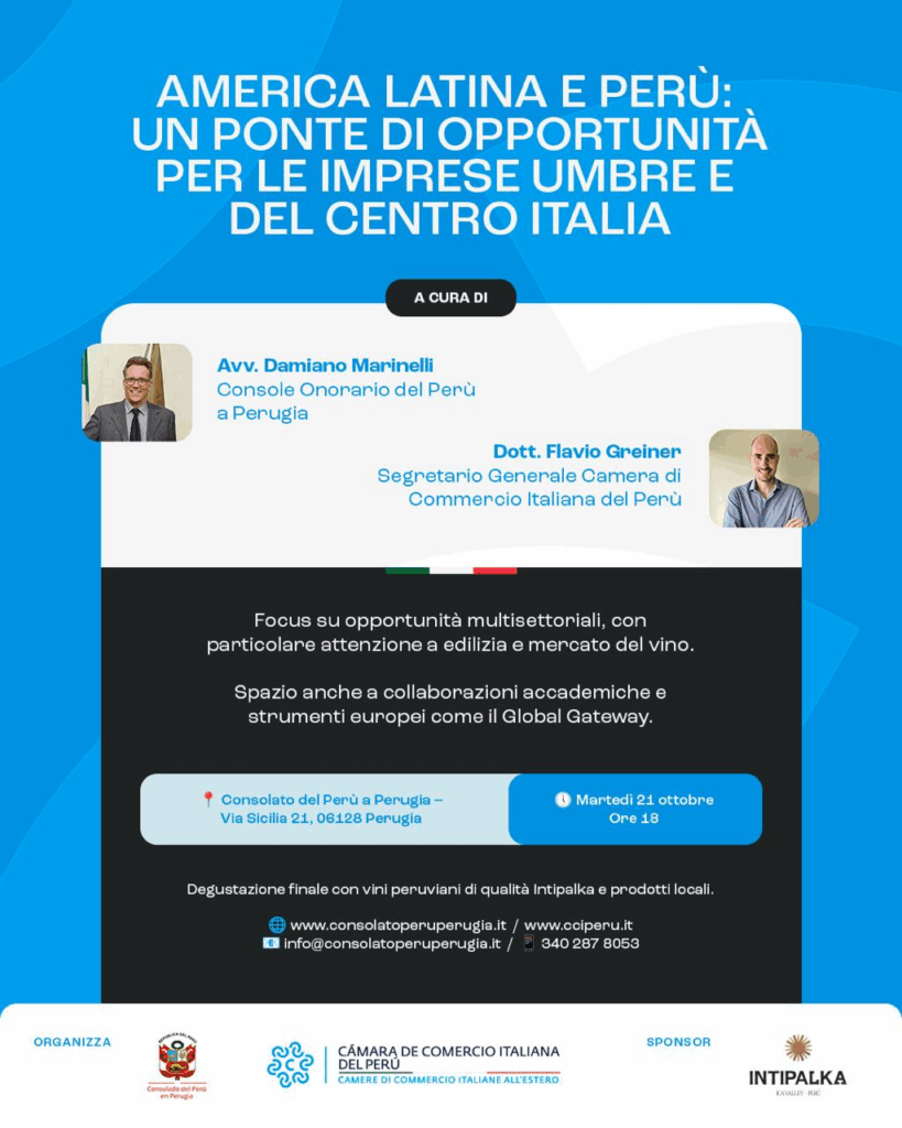 L’iniziativa, promossa dal Console Onorario del Perù in Umbria, l’avvocato Damiano Marinelli, ha rappresentato un momento di confronto concreto tra imprese, università e istituzioni, con l’obiettivo di rafforzare i legami economici, culturali e accademici tra l’Umbria e il continente latinoamericano.