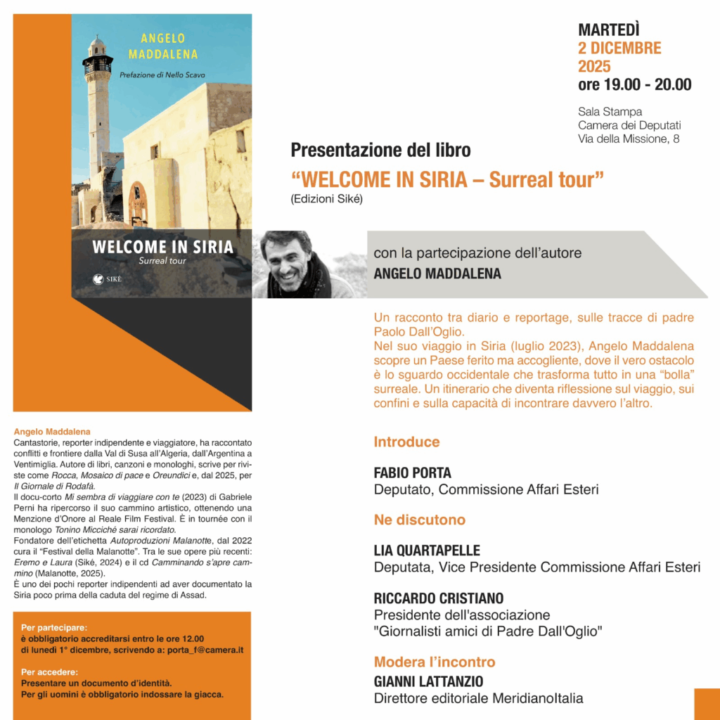 Un filo rosso collega dieci città italiane, una comunità di lettori in movimento e un autore che ha deciso di scrivere della Siria con lo sguardo libero dell’esploratore. Nel tempo che ci impone da un lato la sosta e dall’altro l’accelerazione, questo filo approda ora a Roma, alla Camera dei deputati dove, il 2 dicembre, presso la Sala Stampa, l’On. Fabio Porta accoglierà Angelo Maddalena, per l’ultima tappa di un tour che è già diventato un piccolo caso culturale.