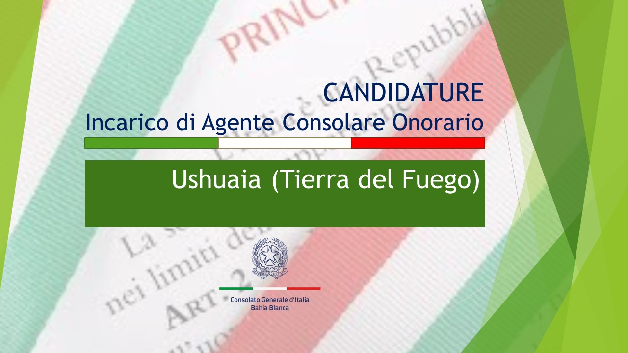 Il Consolato Generale a Bahia Blanca intende nominare un nuovo agente console onorario a Ushuaia, per lo svolgimento di funzioni di assistenza in favore dei cittadini italiani e tutela degli interessi italiani nella provincia di Tierra del Fuego.
