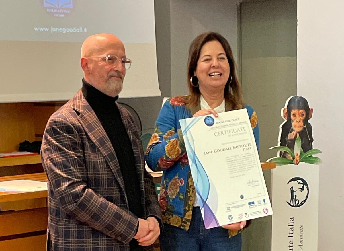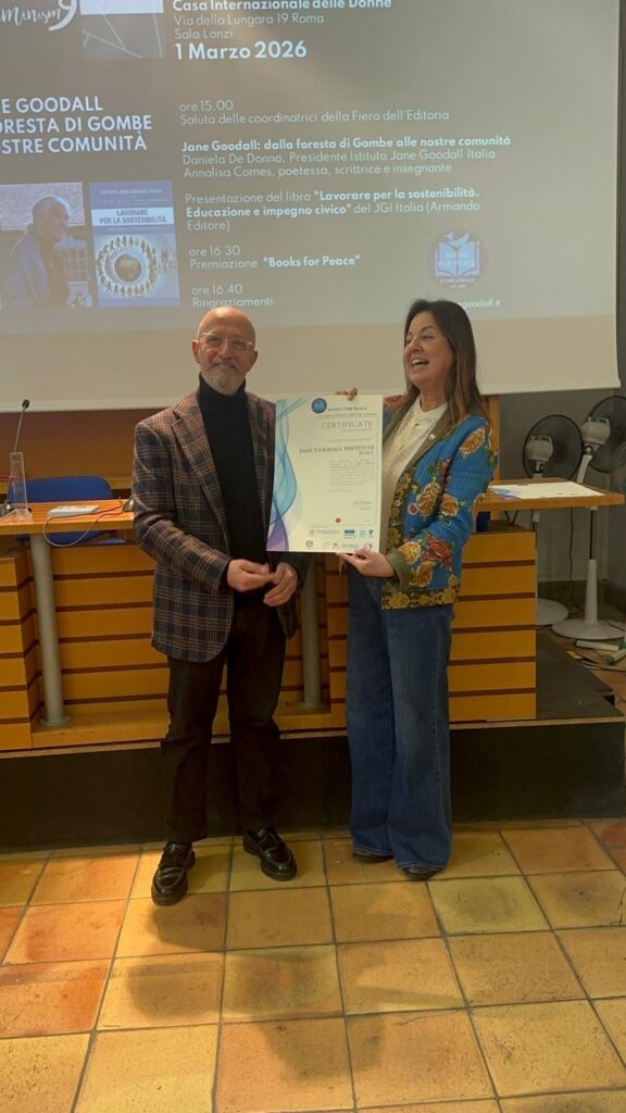 Il riconoscimento BOOKS for PEACE ha valorizzato il lavoro dell’organizzazione fondata dalla primatologa Jane Goodall, attiva a livello globale nella protezione della biodiversità e nella realizzazione di programmi educativi rivolti alle giovani generazioni, tra cui il progetto internazionale Roots & Shoots.