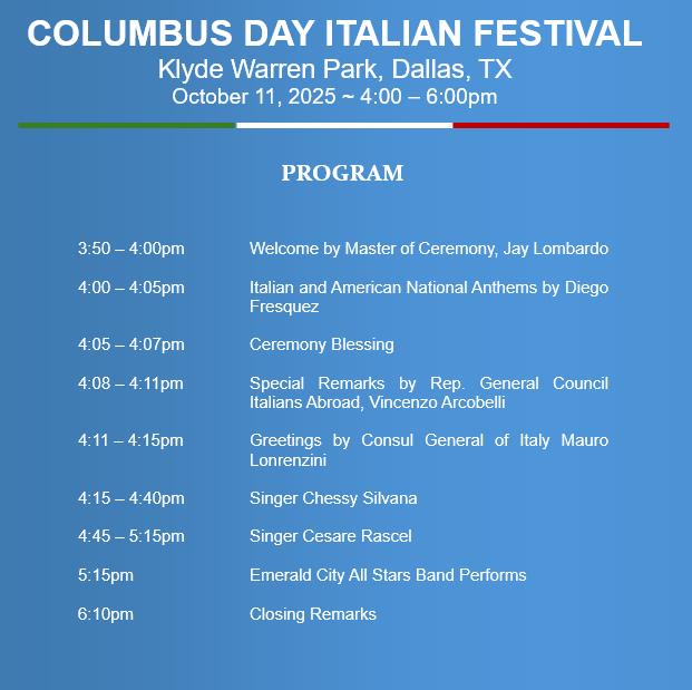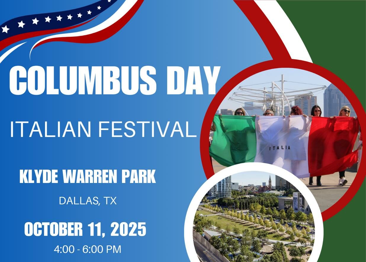 Anche quest’anno, in occasione dell’undicesimo anniversario del Columbus Day in Texas, che coincide con il Mese del Patrimonio Italo-Americano, l’11 ottobre andrà in scena la tradizionale manifestazione al Klyde Warren Park, nel cuore di Dallas. L’evento trasformerà il celebre parco in un angolo vivace d’Italia, animato da cultura, musica e spirito comunitario.