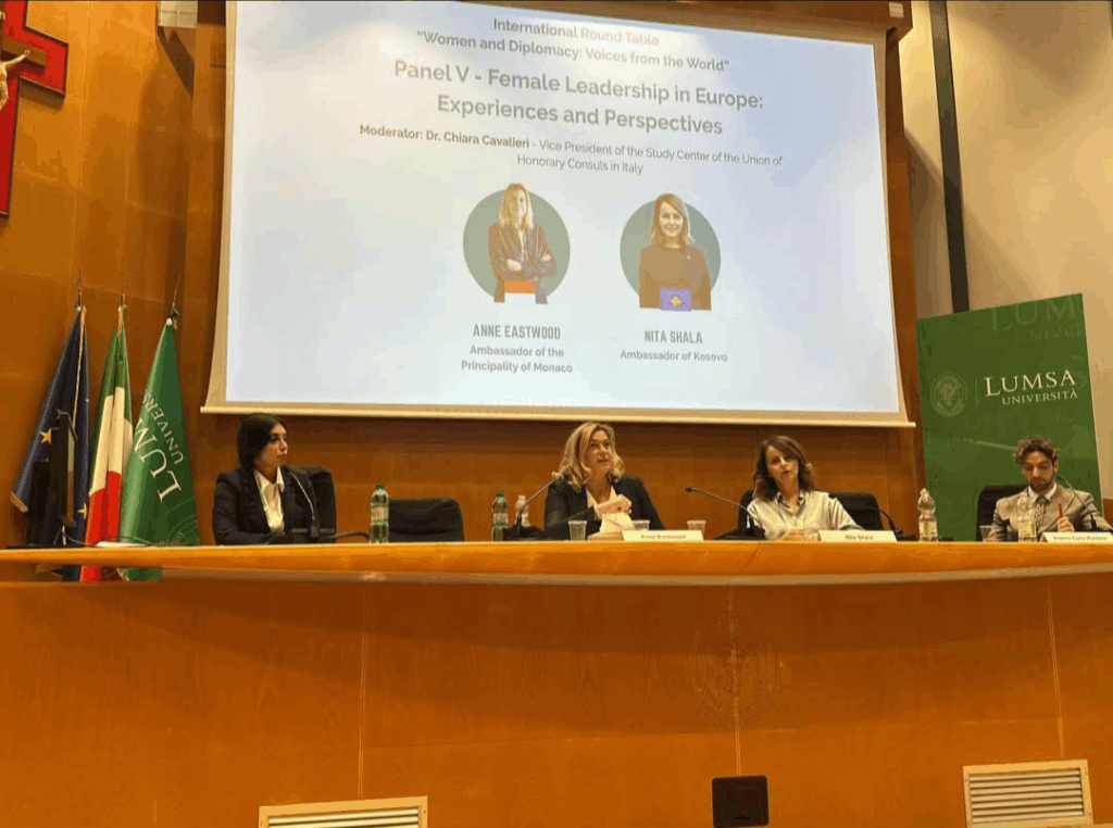 Circondata da una dozzina di omologhi di ogni regione del mondo, l’Ambasciatore di Monaco in Italia è intervenuta nel panel «Leadership femminile in Europa: esperienze e prospettive».