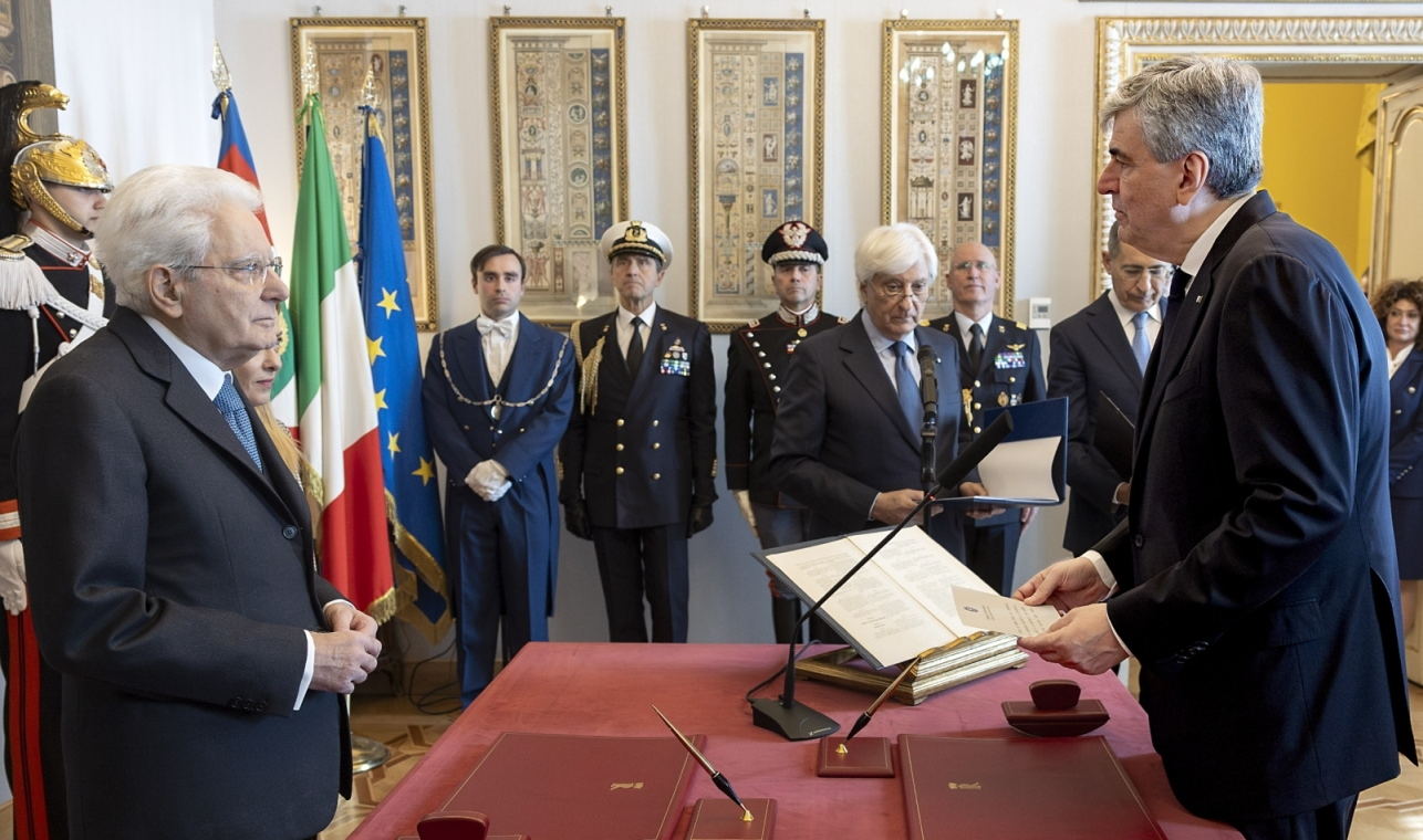 Subito dopo il nuovo Ministro ha prestato giuramento nelle mani del Presidente della Repubblica, alla presenza, in qualità di testimoni, del Segretario Generale della Presidenza della Repubblica, Dott. Ugo Zampetti, e del Consigliere Militare del Presidente della Repubblica, Generale Gianni Candotti.