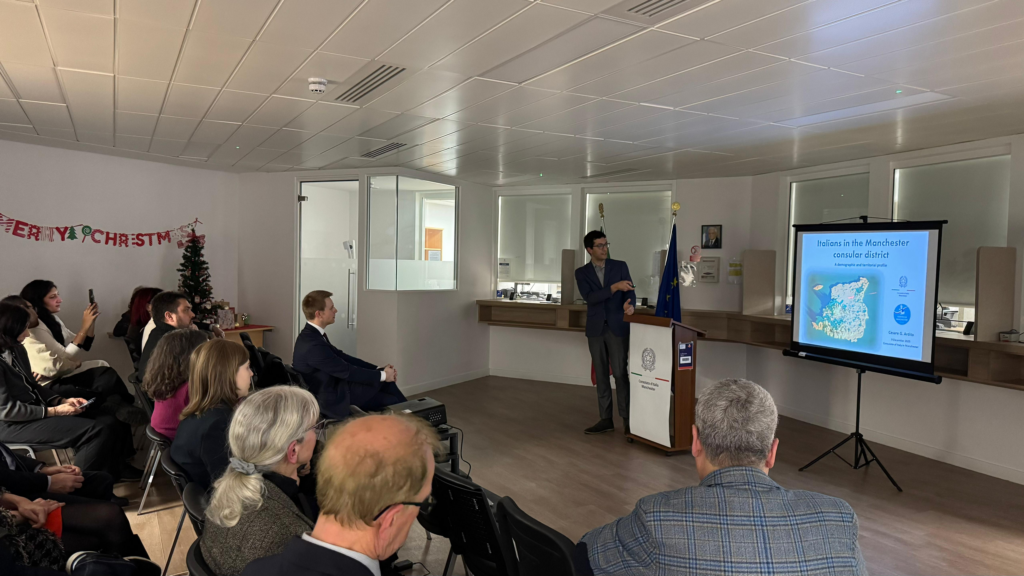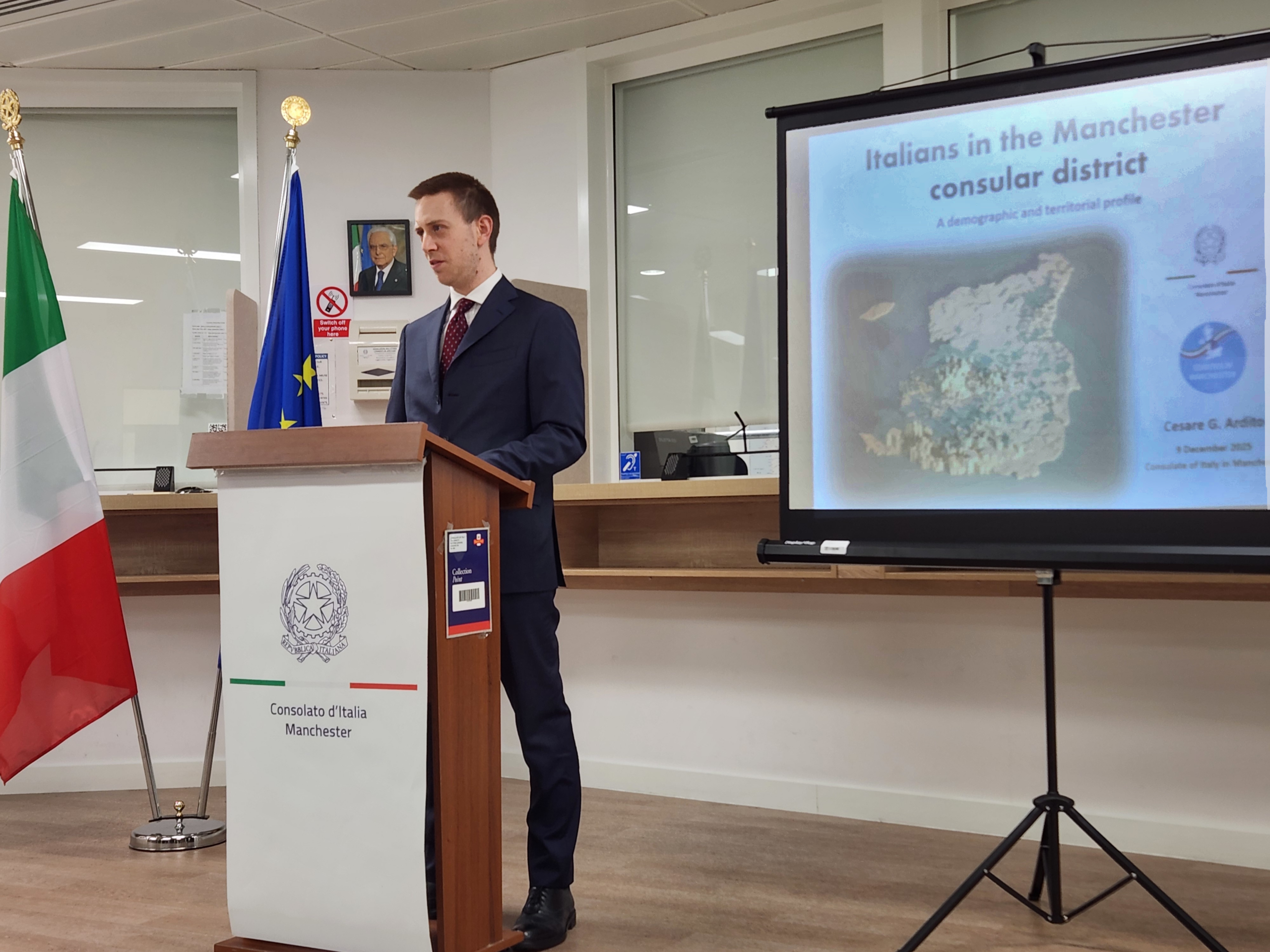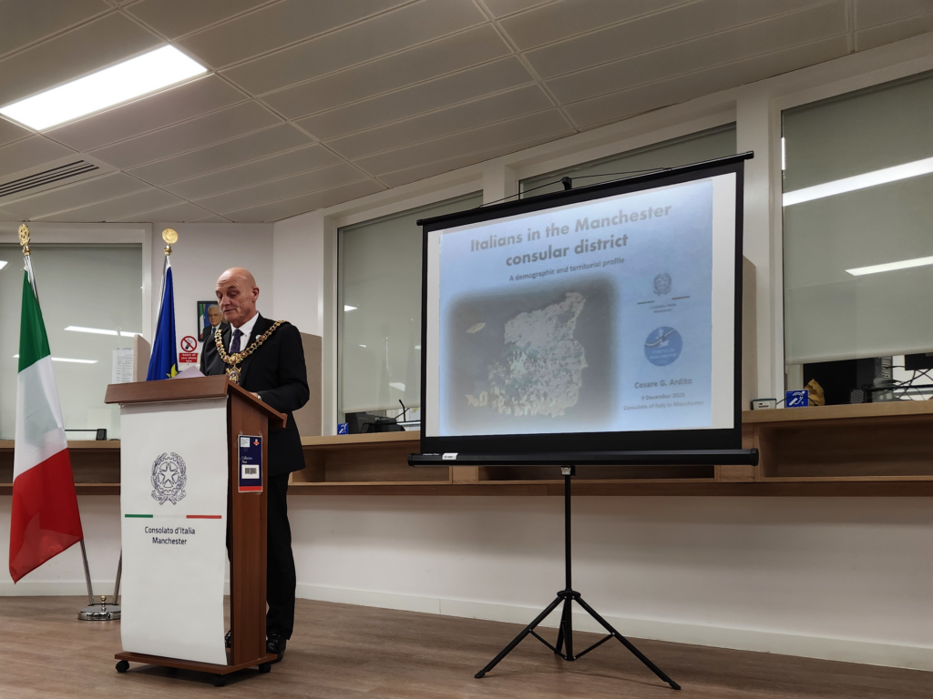 È stato presentato nella serata di martedì, presso il Consolato d’Italia a Manchester e su iniziativa congiunta dello stesso Consolato e del Comites di Manchester, lo studio statistico “Gli italiani nella circoscrizione consolare di Manchester”. La pubblicazione, grazie al lavoro di analisi svolto dal Presidente del Comites, Cesare Ardito, docente dell’Università di Manchester, offre una fotografia aggiornata della comunità italiana nella circoscrizione consolare di Manchester. All’evento sono intervenuti il Lord Mayor della città di Manchester, Carmine Grimshaw, di origini italiane, che ha portato il suo saluto istituzionale, e il Console d’Italia Gabriele Magagnin, che ha introdotto i lavori. Hanno altresì partecipato numerosi Consiglieri del Comites, Presidenti di associazioni italiane sul territorio, rappresentanti del mondo accademico, dei patronati e degli enti promotori di lingua e cultura attivi nella circoscrizione.
