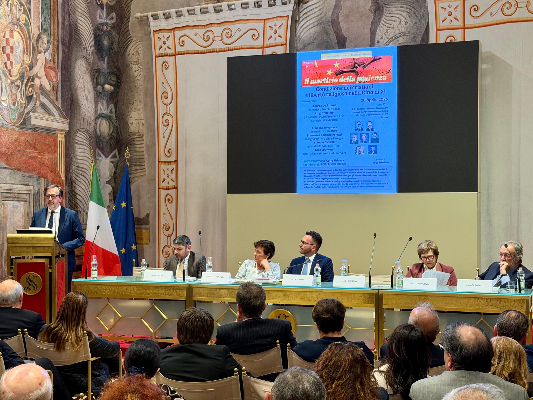 Nella prestigiosa cornice della Sala Zuccari di Palazzo Giustiniani si è tenuto oggi il convegno “Il martirio della pazienza – Condizione dei cristiani e libertà religiosa nella Cina di Xi”, promosso su iniziativa del senatore Andrea De Priamo. Un appuntamento che ha riunito giornalisti, studiosi e rappresentanti del mondo associativo e istituzionale, con il fine di approfondire la condizione delle comunità cristiane in Cina e, più in generale, il rapporto tra identità, libertà religiosa e sistemi politici.