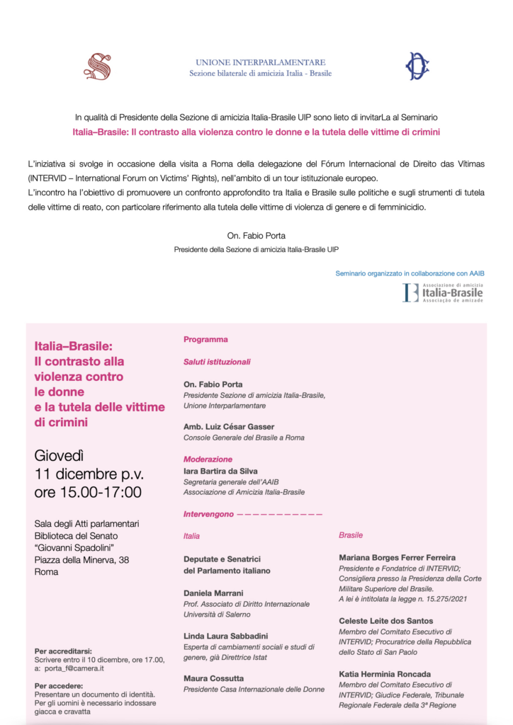 L’iniziativa, presieduta dall’On. Fabio Porta, si svolge in occasione della visita in Italia della delegazione del Fórum Internacional de Direito das Vítimas (INTERVID – International Forum on Victims’ Rights), impegnata in un tour istituzionale europeo finalizzato allo scambio di buone pratiche in materia di tutela delle vittime di reato. L’incontro intende favorire un confronto approfondito tra istituzioni, esperti ed esponenti della società civile di Italia e Brasile, con particolare attenzione alle politiche contro la violenza di genere e ai meccanismi di protezione delle vittime.