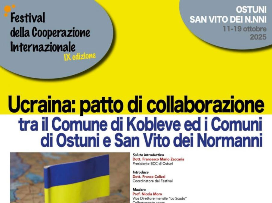 Nell’ambito della nona edizione del Festival della Cooperazione Internazionale, la Banca di Credito Cooperativo di Ostuni ha ospitato un importante incontro dedicato alla firma e presentazione del Patto di Collaborazione tra il Comune di Kobleve (Ucraina) e i Comuni di Ostuni e San Vito dei Normanni.