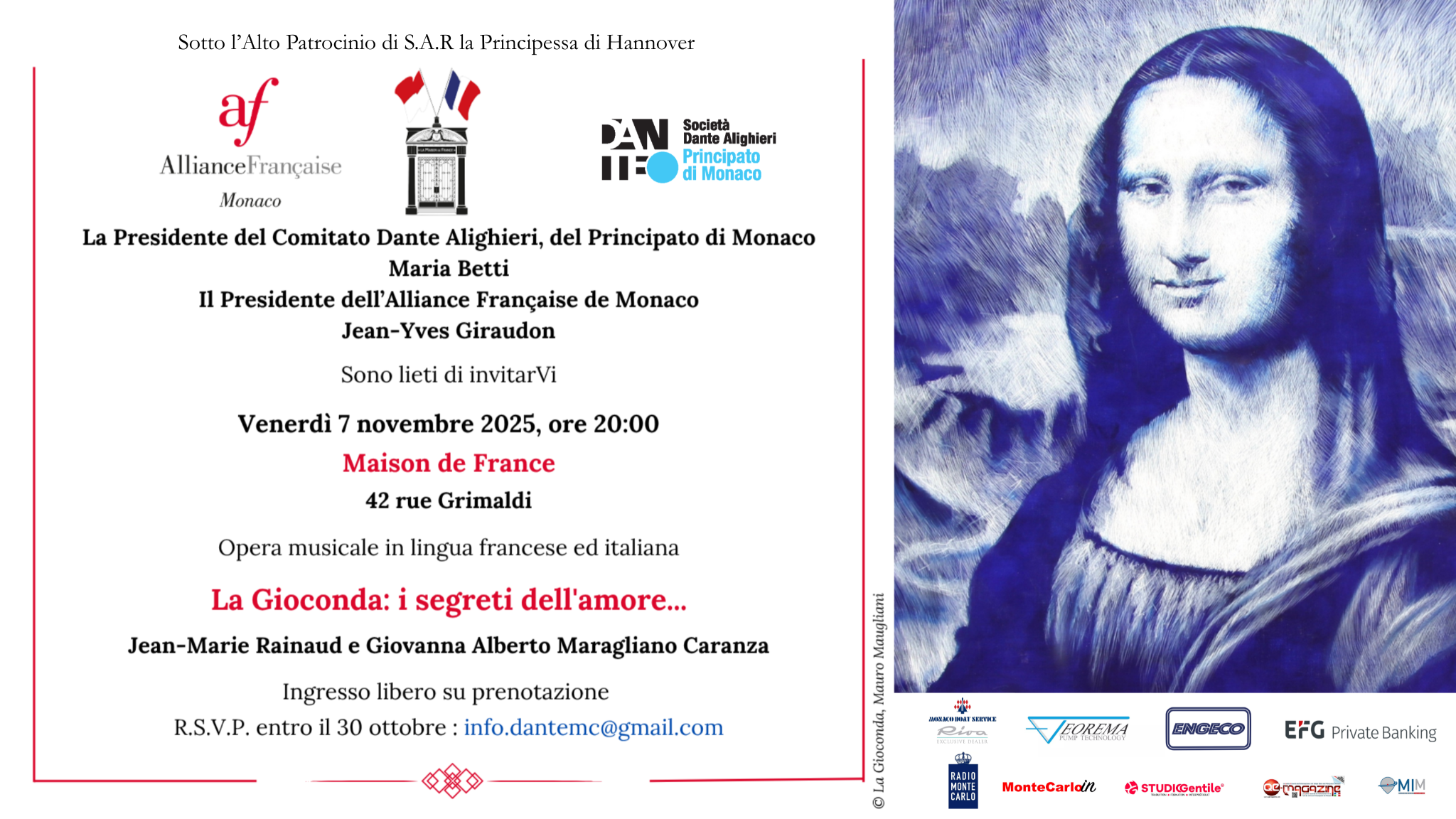 Il Comitato Dante Alighieri del Principato di Monaco, sotto l’Alto Patrocinio di S.A.R. la Principessa di Hannover, in collaborazione con l’Alliance Française de Monaco presenta, venerdì 7 novembre, alle ore 20, alla Maison de France (42 rue Grimaldi), l’evento musicale “la Gioconda: i segreti dell’amore…” / “La Joconde amoureuse”.