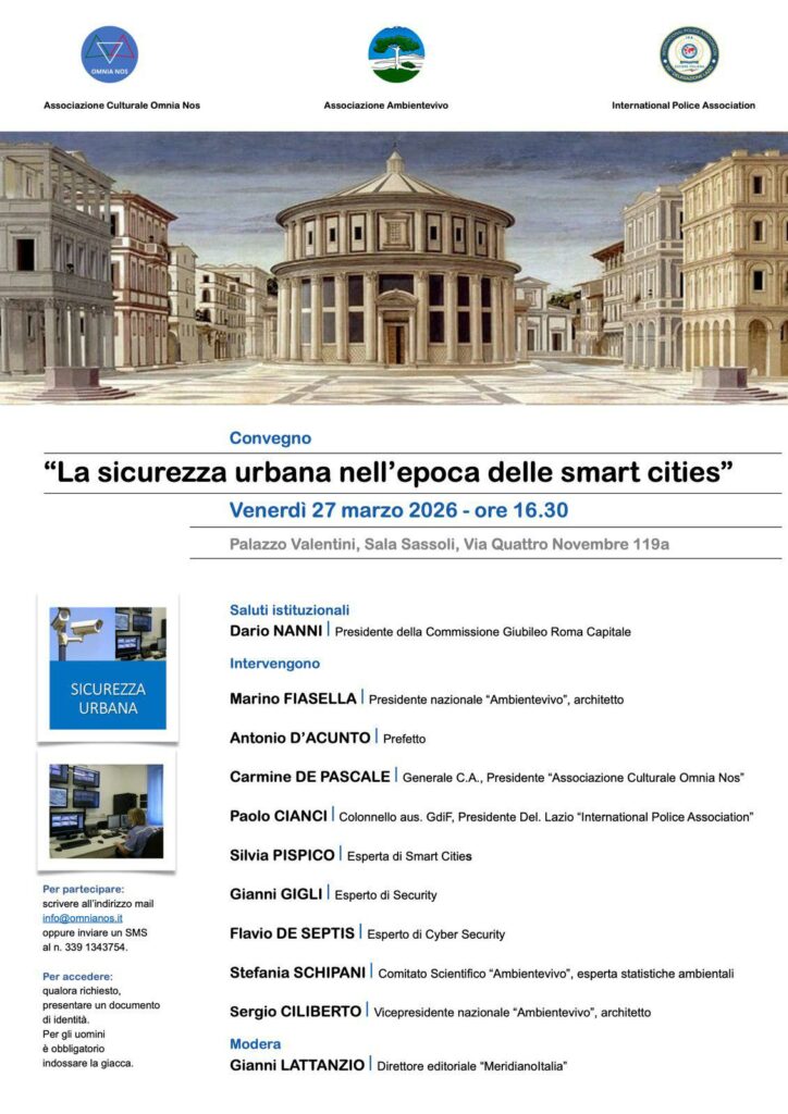 Dopo i saluti istituzionali di Dario Nanni, Presidente della Commissione Giubileo di Roma Capitale, il dibattito metterà al centro il ruolo delle tecnologie digitali nella sicurezza urbana, in un momento in cui la capitale sta implementando piani e progetti innovativi che spaziano dalla gestione intelligente della mobilità ai sistemi di videosorveglianza avanzata. Interverranno Marino Fiasella, Presidente nazionale “Ambientevivo” e architetto, il Prefetto Antonio D’Acunto, il Generale C.A. Carmine De Pascale, Presidente di Omnia Nos, il coordinatore scientifico di CISC CNR, Maurizio Gentilini, il Colonnello aus. della Guardia di Finanza Paolo Cianci, Presidente della International Police Association – sezione Lazio, l’esperta di smart cities Silvia Pispico, l’esperto di security Gianni Gigli, lo specialista di cyber security Flavio De Septis, l’esperta di statistiche ambientali Stefania Schipani e l’architetto Sergio Ciliberto; modera Gianni Lattanzio, direttore editoriale di “MeridianoItalia”.
