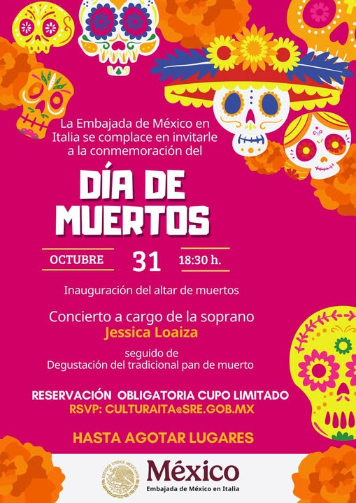 li prossimo 31 ottobre, alle ore 18:30, l’Ambasciata del Messico in Italia aprirà le sue porte per una serata dedicata alla commemorazione del Día de Muertos, una delle tradizioni più emblematiche e sentite della cultura messicana.