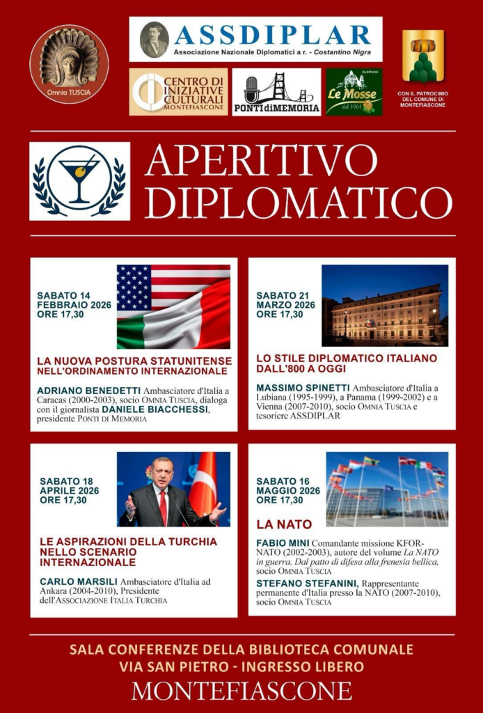Prosegue il ciclo di incontri Aperitivo Diplomatico, rassegna dedicata alla cultura delle relazioni internazionali promossa dal Centro di Iniziative Culturali Omnia Tuscia in collaborazione con l’Associazione Nazionale Diplomatici a Riposo – ASSDIPLAR. Un progetto che riunisce ex ambasciatori, studiosi e giornalisti per offrire al pubblico un percorso di approfondimento sui grandi temi della politica estera contemporanea.