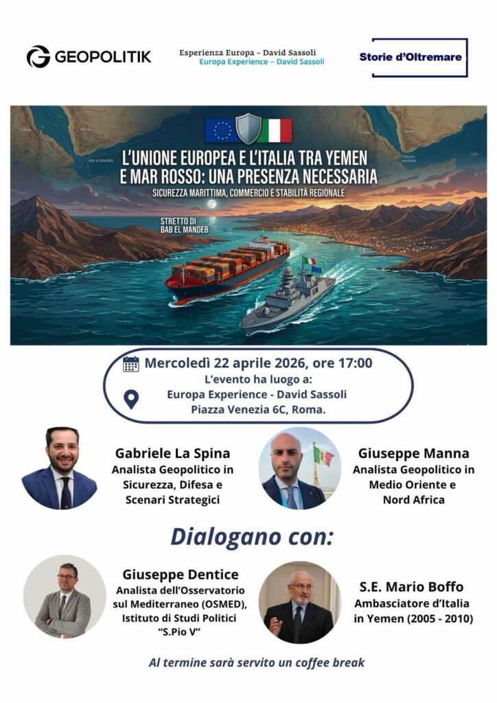 Mercoledì 22 aprile, alle ore 17, gli spazi di Europa Experience – David Sassoli, nel cuore di Piazza Venezia a Roma, ospiteranno un nuovo appuntamento di approfondimento geopolitico dedicato a uno dei quadranti più sensibili del panorama internazionale: il Mar Rosso, il Golfo e lo stretto di Bab el-Mandeb, snodo cruciale per i traffici globali e oggi epicentro di tensioni crescenti.