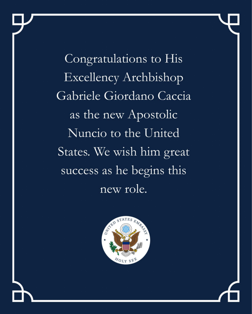 La designazione è stata accolta con favore anche dalle istituzioni statunitensi. L’Ambasciata degli Stati Uniti presso la Santa Sede ha diffuso sui propri canali social un messaggio di congratulazioni rivolto al nuovo nunzio, augurandogli “grande successo” nell’inizio del suo servizio diplomatico negli Stati Uniti. Un gesto che sottolinea l’importanza del ruolo e il valore delle relazioni bilaterali tra Washington e la Santa Sede.