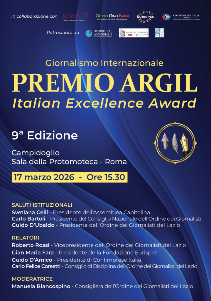 Martedì 17 marzo 2026, alle ore 15.30, nella Sala della Protomoteca in Campidoglio, si terrà la IX edizione del “Premio Giornalistico Internazionale ARGIL – Italian Excellence Award”, appuntamento dedicato alle eccellenze italiane che contribuiscono a promuovere nel mondo talento, creatività e visione internazionale.