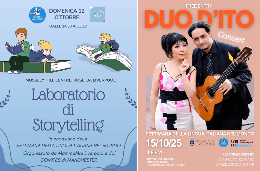 Domenica 12 ottobre, al Mossley Hill Centre in Rose Lane, si terrà un pomeriggio dedicato alle famiglie con un laboratorio di storytelling. Tra voci, immagini e merenda condivisa, la direttrice Anna Cardelli Lynch guiderà i partecipanti attraverso un percorso creativo di immagini, parole ed emozioni, facilitando il dialogo tra lingua italiana, immaginazione ed espressività. In programma la lettura degli albi “Io sono foglia” per bambini dai 3 ai 7 anni e “Se fossi Ugo” per bambini dagli 8 ai 12 anni.