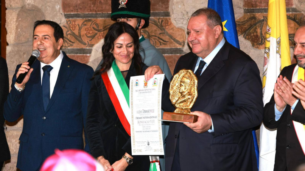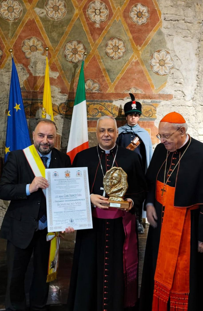 Grande successo per la solenne e seconda sessione della XXIII edizione del conferimento del Premio Bonifacio VIII, che si tenuta presso la Sala dello Schiaffo del Palazzo Papale di Anagni alla presenza del Presidente Onorario e Patrono Spirituale dell’Accademia Bonifaciana, il Cardinale Leonardo Sandri, Vice Decano del Sacro Collegio. “Siamo onorati di avere al nostro fianco un uomo di tale statura spirituale e diplomatica. Il cardinale Sandri – ha detto il Rettore Presidente Sante De Angelis, durante il saluto iniziale – è un faro di luce e di speranza per la nostra comunità e siamo certi che la sua guida e il suo sostegno ci aiuteranno a raggiungere nuovi traguardi. Grazie, Eminenza, per aver accettato questo importante incarico e per il vostro impegno a favore della nostra Accademia”.