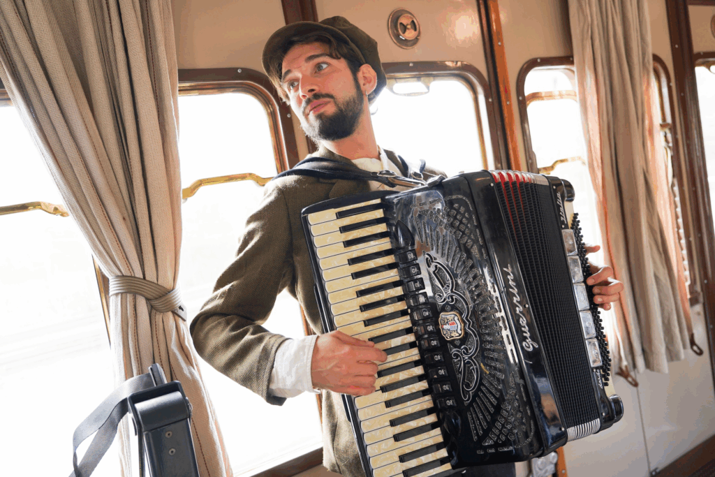 La drammaturgia accompagna i passeggeri lungo l’intera tratta ferroviaria con tre momenti performativi che dialogano con i luoghi: l‘accoglienza alla stazione di Agrigento Centrale, una seconda performance immersa nel paesaggio archeologico nei pressi del Tempio di Vulcano e la conclusione nella stazione di Porto Empedocle Centrale, la Vigata di Andrea Camilleri. Ogni carrozza diventa un set d’epoca, con oggetti, voci e musiche che riportano nel 1934, anno del Nobel a Luigi Pirandello, per poi condurre fino agli anni ’90 di Camilleri, offrendo un percorso narrativo che rende il patrimonio materiale e immateriale del territorio parte integrante dell’esperienza.