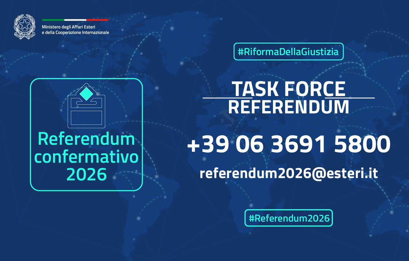 Il Ministro degli Esteri, Antonio Tajani, ha istituito alla Farnesina un’apposita Task Force elettorale in vista del Referendum costituzionale del 22 e 23 marzo prossimi. Tale Unità operativa segue il coordinamento dei piani logistici e assiste la rete diplomatico-consolare nella gestione delle operazioni di voto e coordinerà le operazioni relative agli oltre 80 voli previsti per il rientro in Italia delle schede votate. È stato attivato anche un numero dedicato (06 3691 5800), operativo 24 ore su 24, per fornire assistenza e informazioni ai cittadini italiani all’estero.