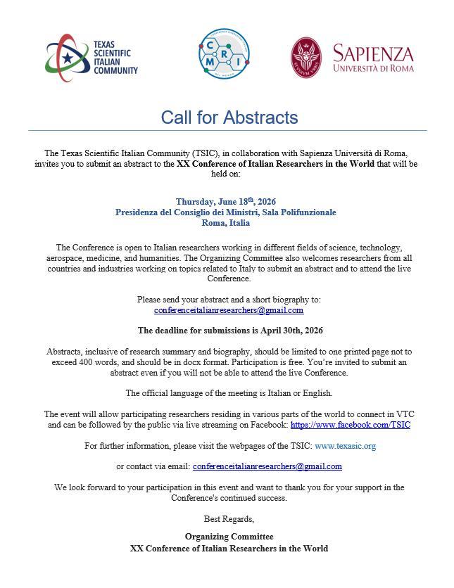La Texas Scientific Italian Community (TSIC), insieme alla Sapienza Università di Roma, ha resto noto che la XX Conferenza dei Ricercatori Italiani nel Mondo, in programma il 18 giugno 2026, si terrà presso la Sala Polifunzionale della Presidenza del Consiglio dei Ministri, a Roma. L’iniziativa si conferma come uno dei principali appuntamenti dedicati alla valorizzazione del contributo scientifico degli italiani all’estero e al rafforzamento del legame tra la diaspora accademica e il sistema della ricerca nazionale.